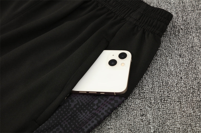 Pantalón negro con detalles rojos y panel camo igual que las otras versiones.