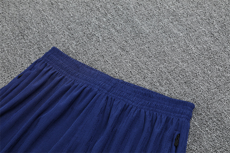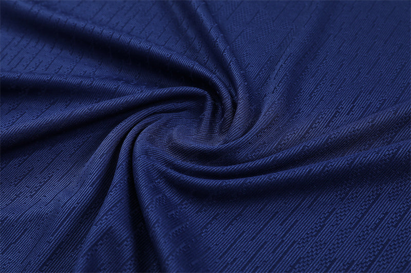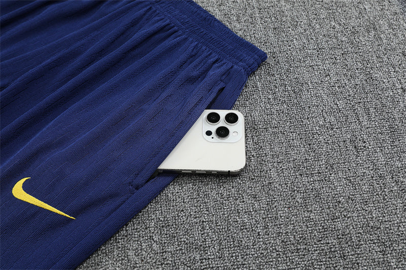 Una versión más clásica y sobria del kit de entrenamiento, con el tradicional azul marino dominando y acentos amarillos que irradian energía.