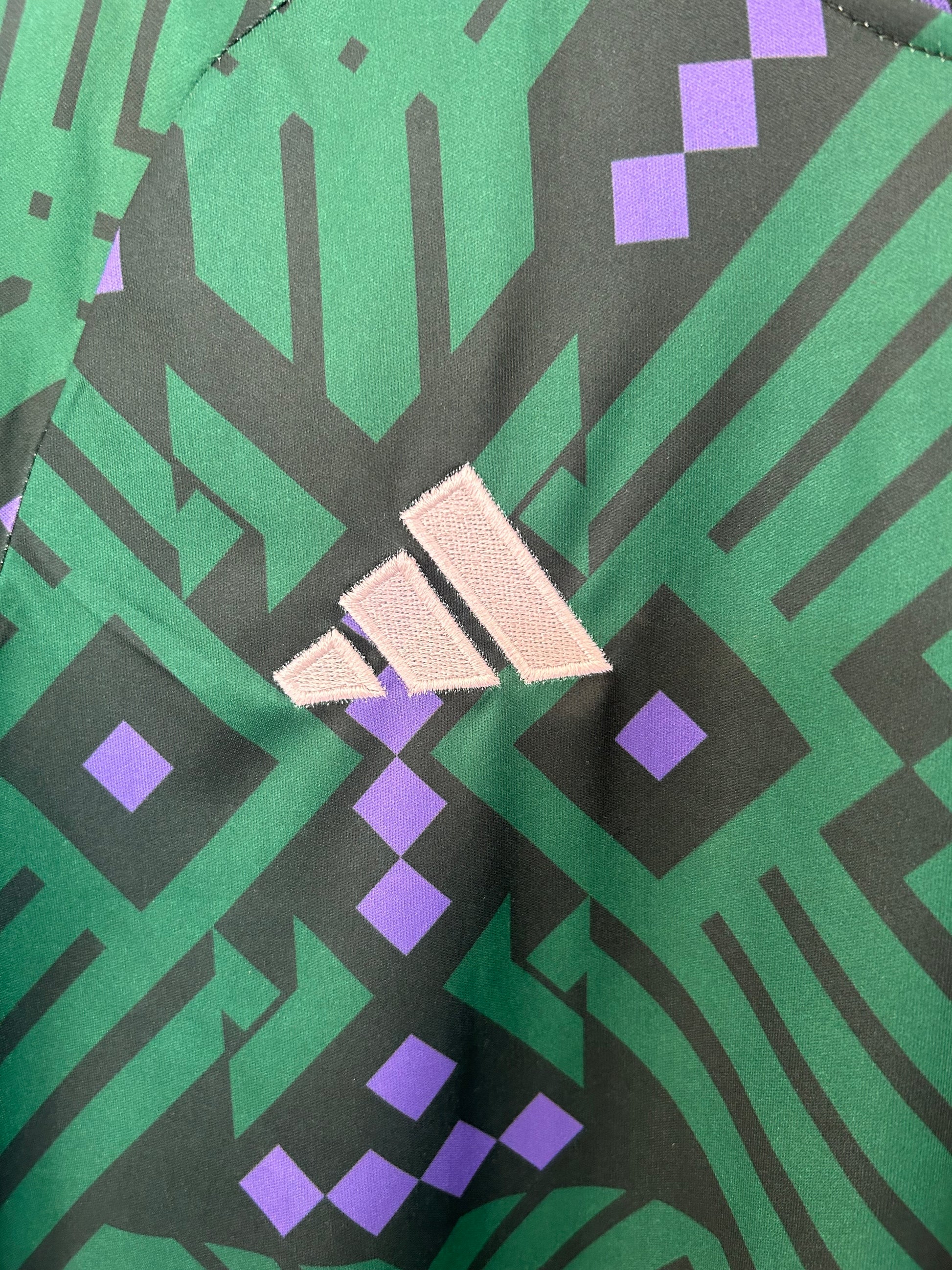 La camiseta local de la Saudi Arabia national football team destaca por su diseño verde con patrones geométricos modernos y detalles en tonos contrastantes que reflejan identidad y estilo.