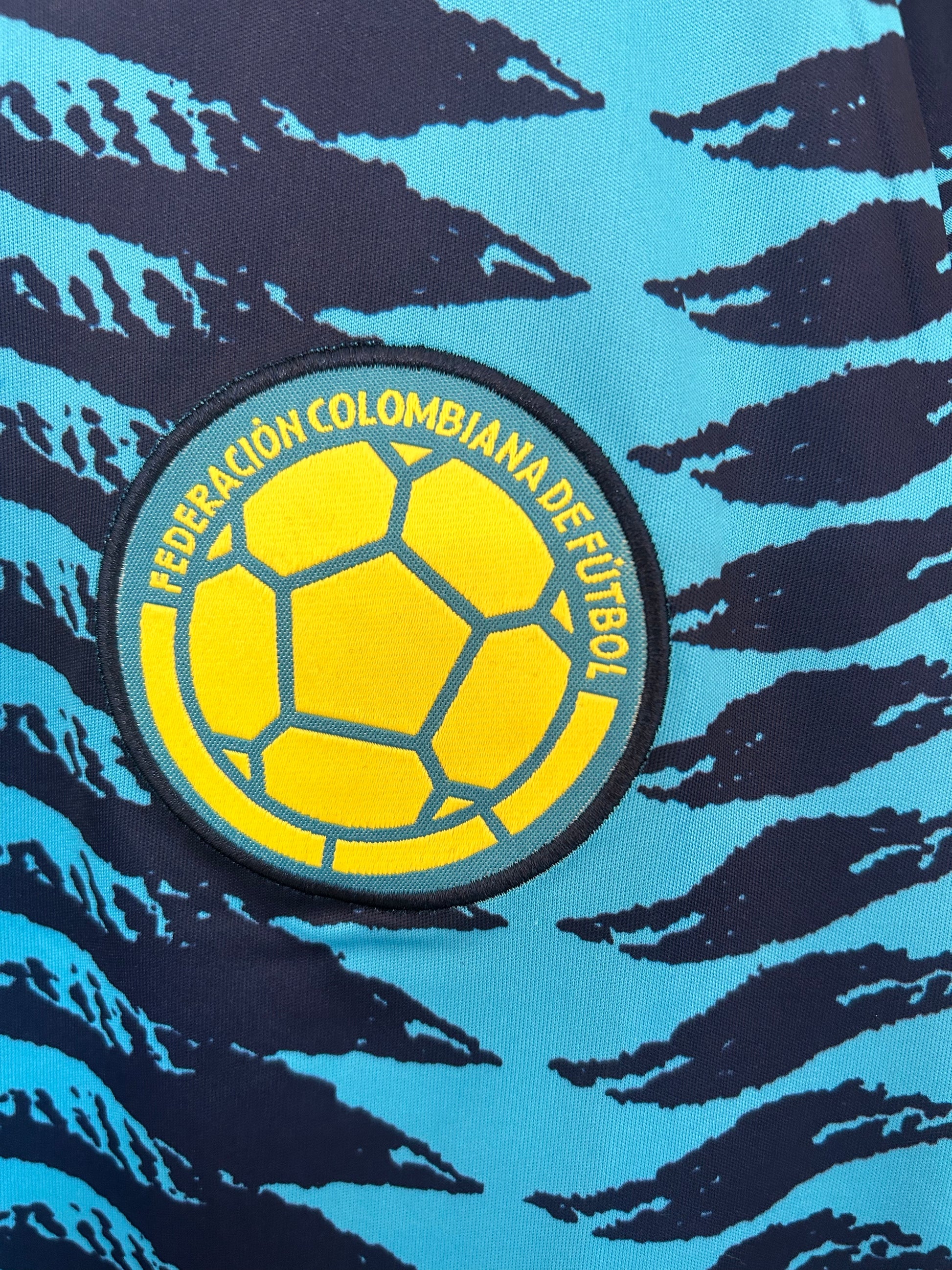 La camiseta alternativa de la Colombia national football team presenta un diseño vibrante en azul con un patrón gráfico dinámico que le aporta personalidad y estilo moderno.