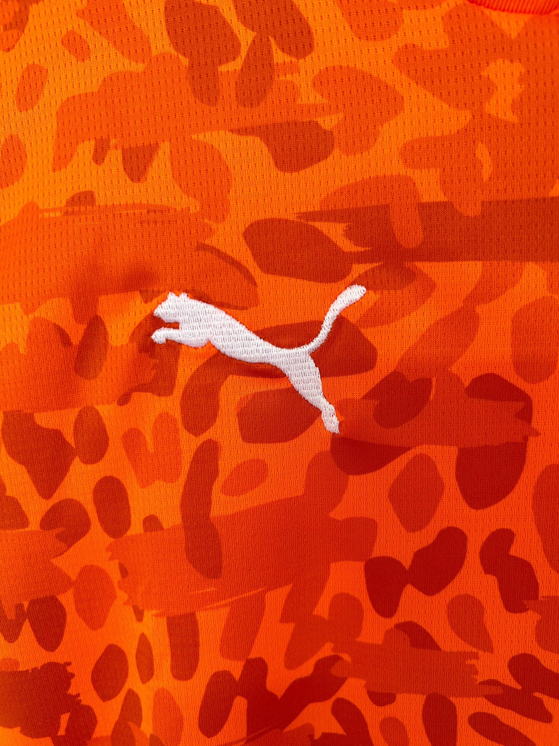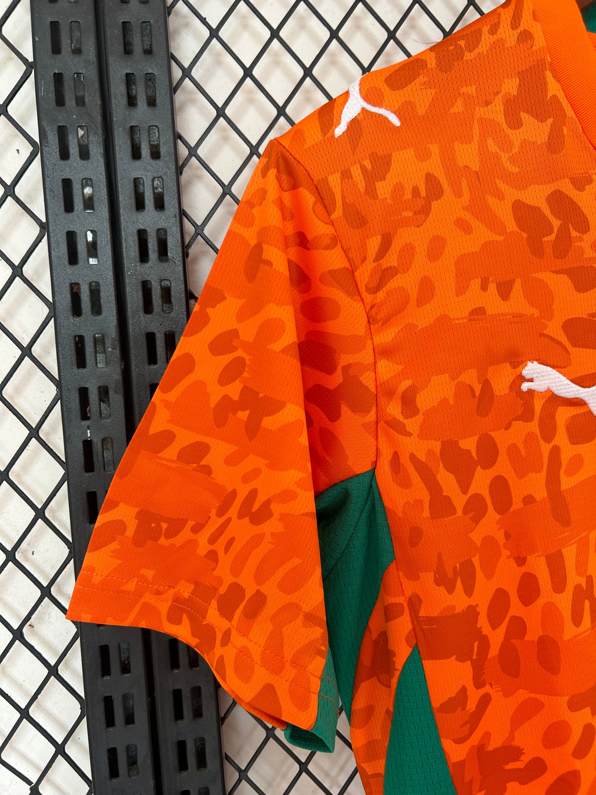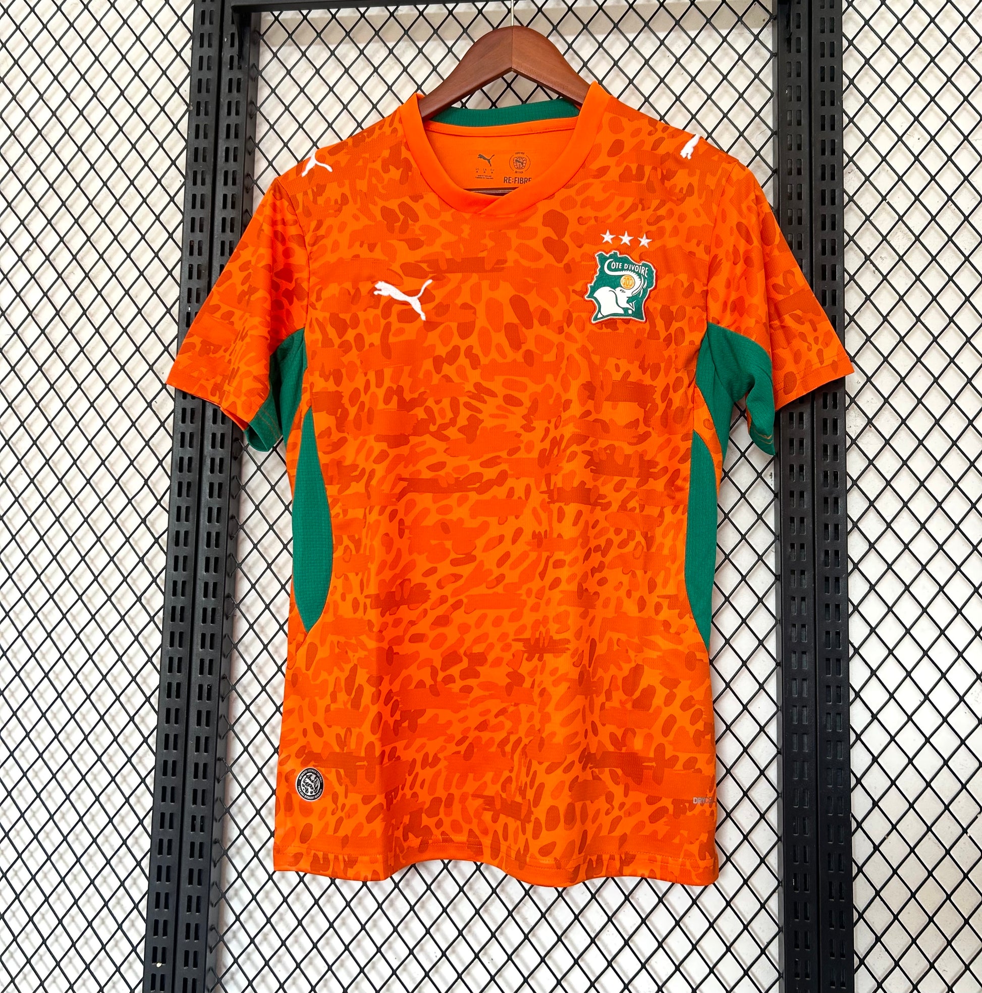 Presenta una base en color naranja vibrante, símbolo histórico de la selección marfileña, acompañada de paneles laterales en verde que aportan contraste y refuerzan los colores nacionales. El patrón gráfico tonal en todo el frontal añade textura y dinamismo, mientras que el escudo oficial con las estrellas en el pecho representa la grandeza del equipo.