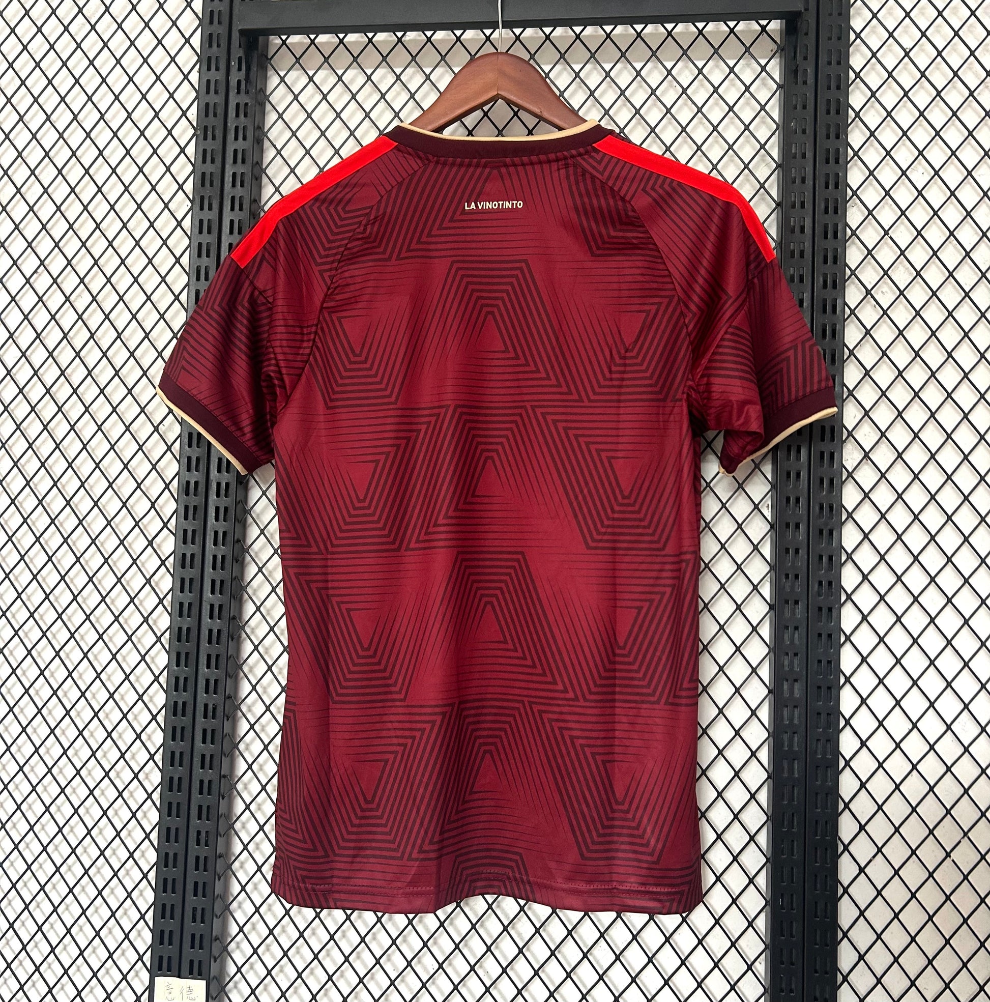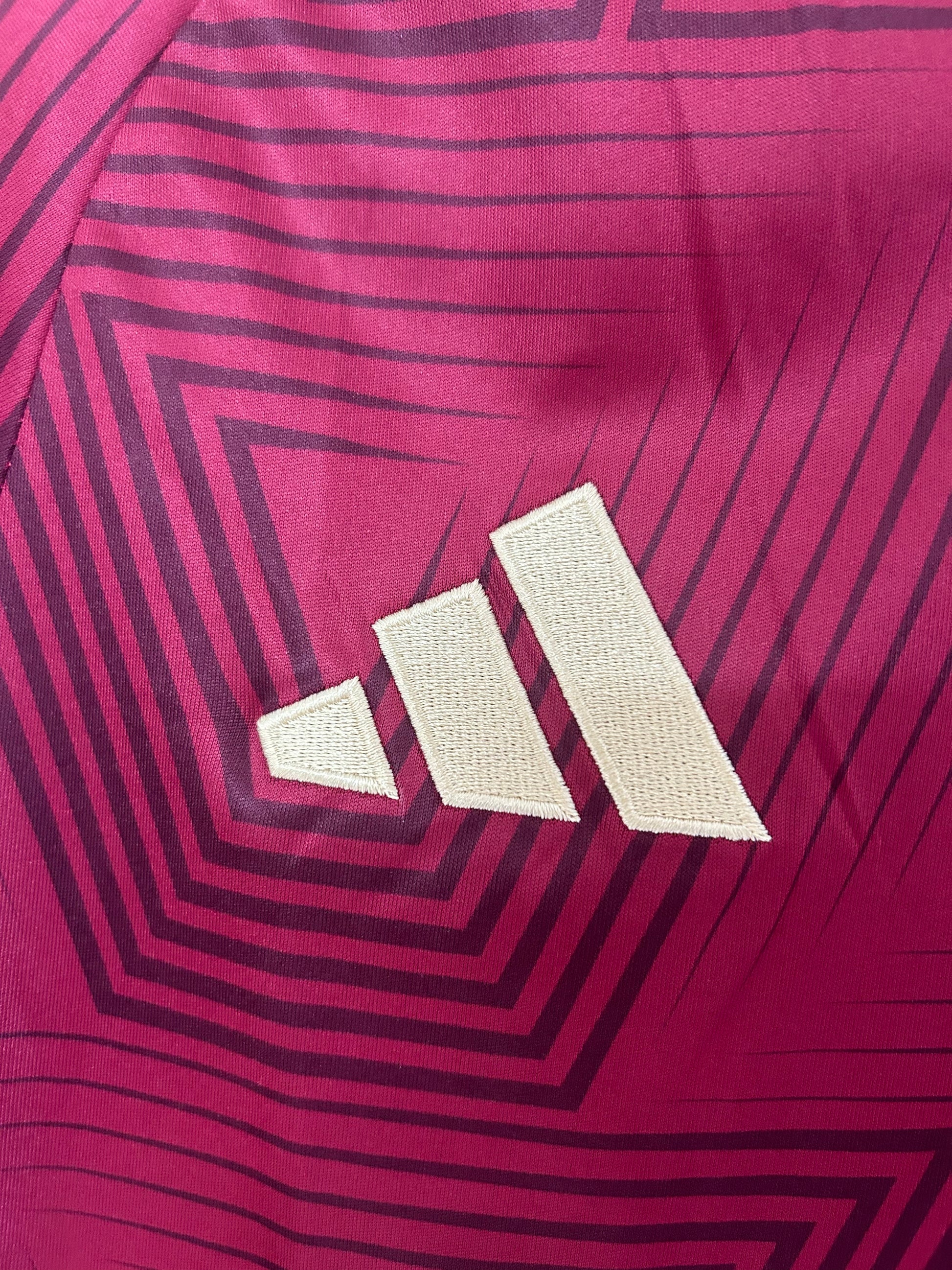 La camiseta local de la Ecuador national football team presenta un elegante tono granate con un patrón geométrico en relieve que le da profundidad y un estilo moderno.