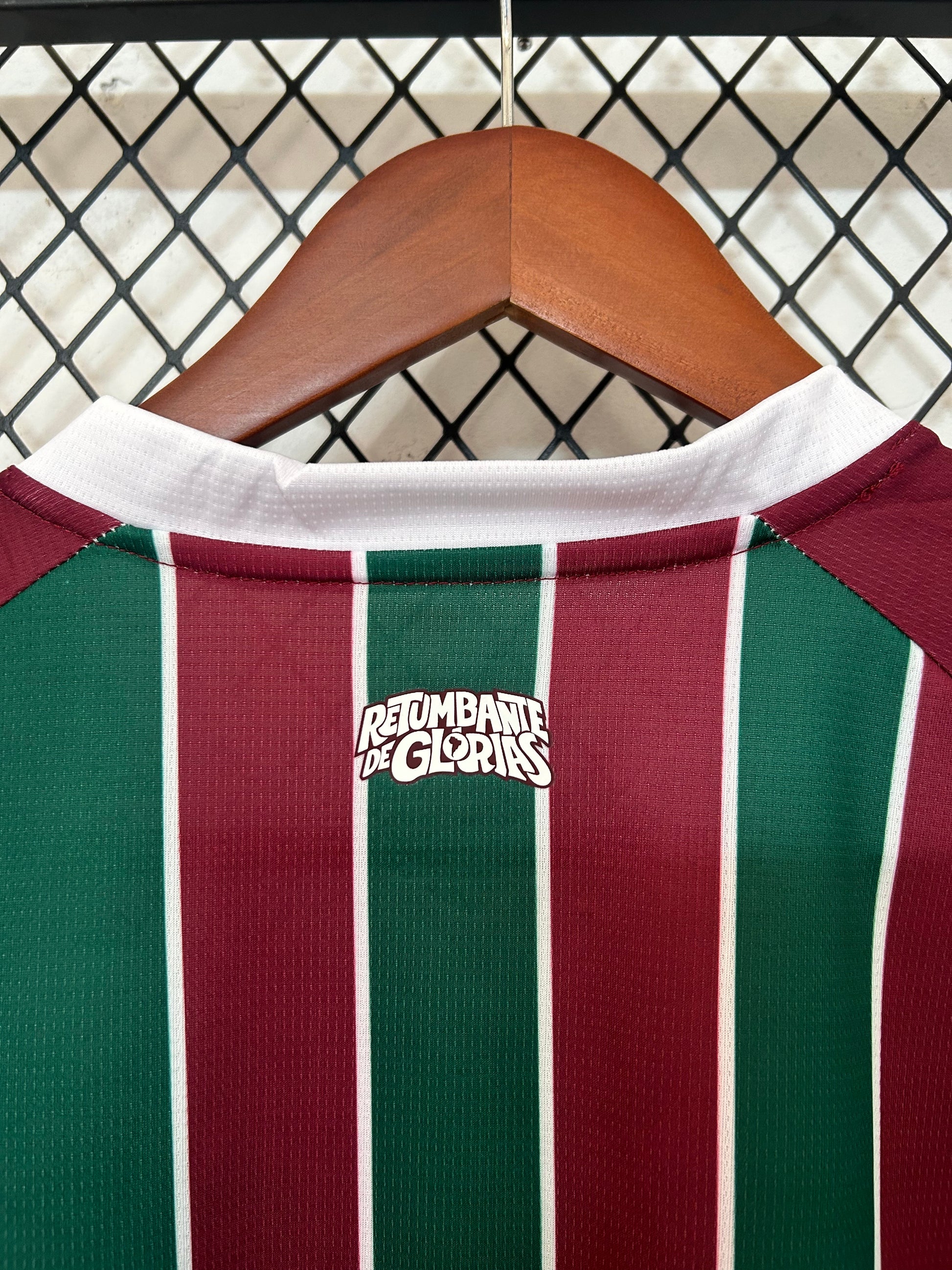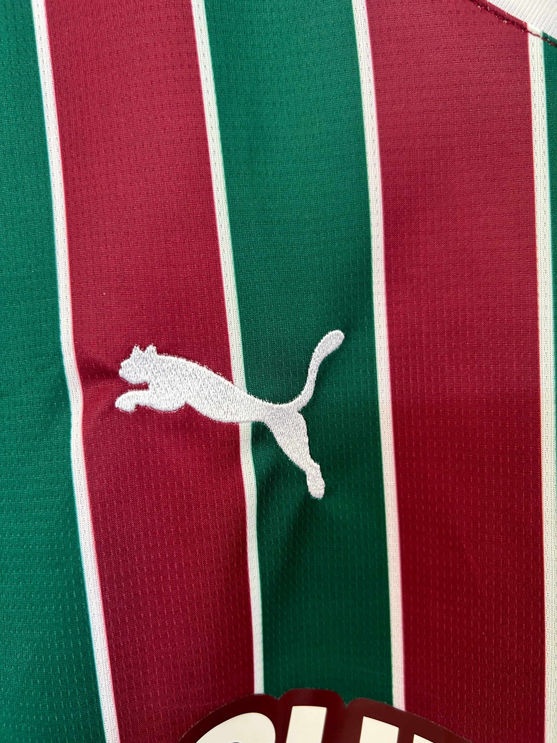 En el pecho destacan el escudo oficial del Fluminense, el logotipo de Puma y el patrocinador Superbet, creando un contraste limpio y llamativo sobre las franjas tradicionales. El cuello en forma de “V” con detalles blancos aporta un acabado clásico que refuerza el estilo del uniforme.