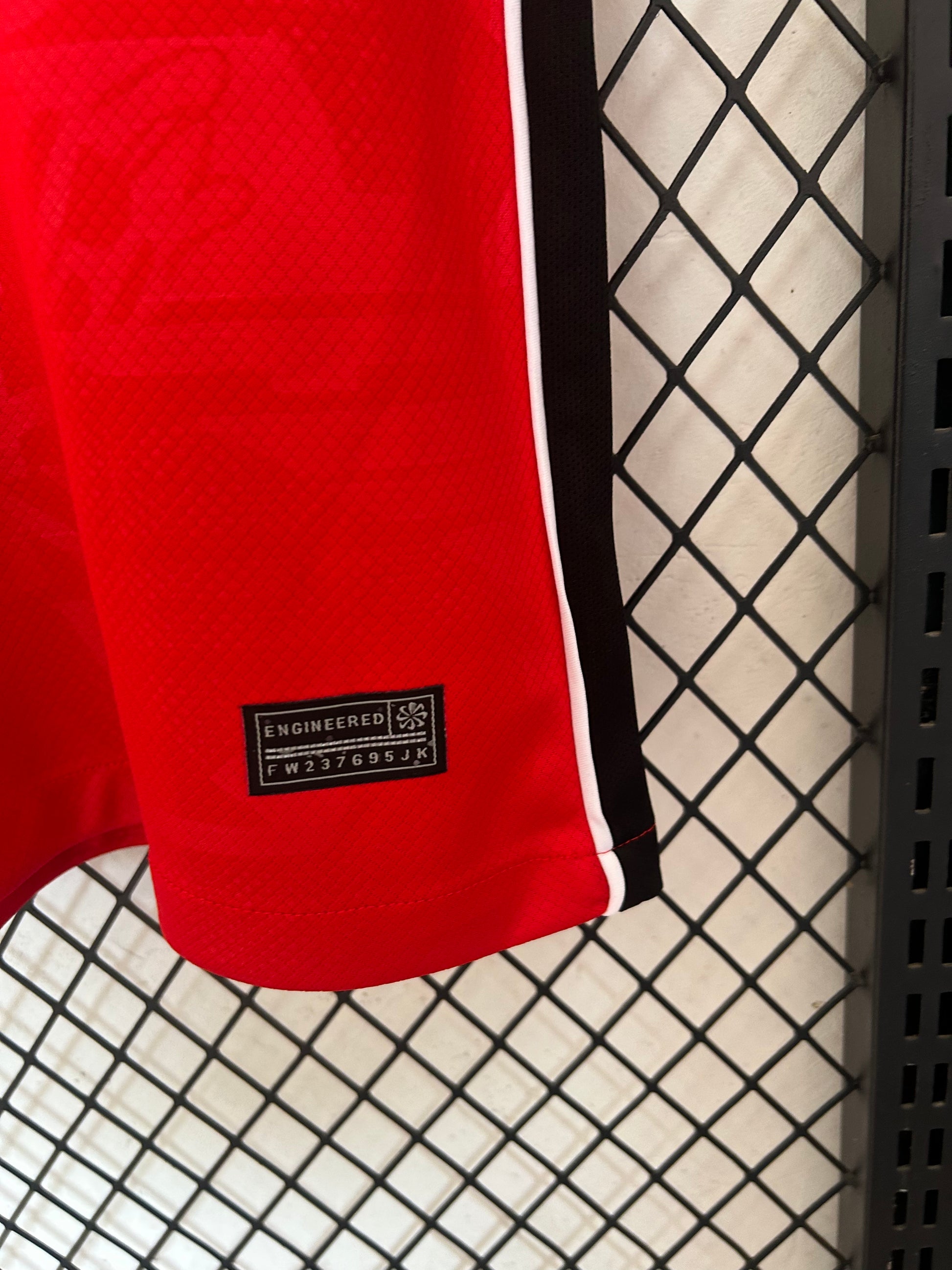 Presenta una base roja intensa con detalles en negro y blanco en cuello y mangas que aportan contraste y carácter. El escudo de Inglaterra en el pecho, acompañado por la estrella conmemorativa, refuerza la identidad histórica de los Three Lions.