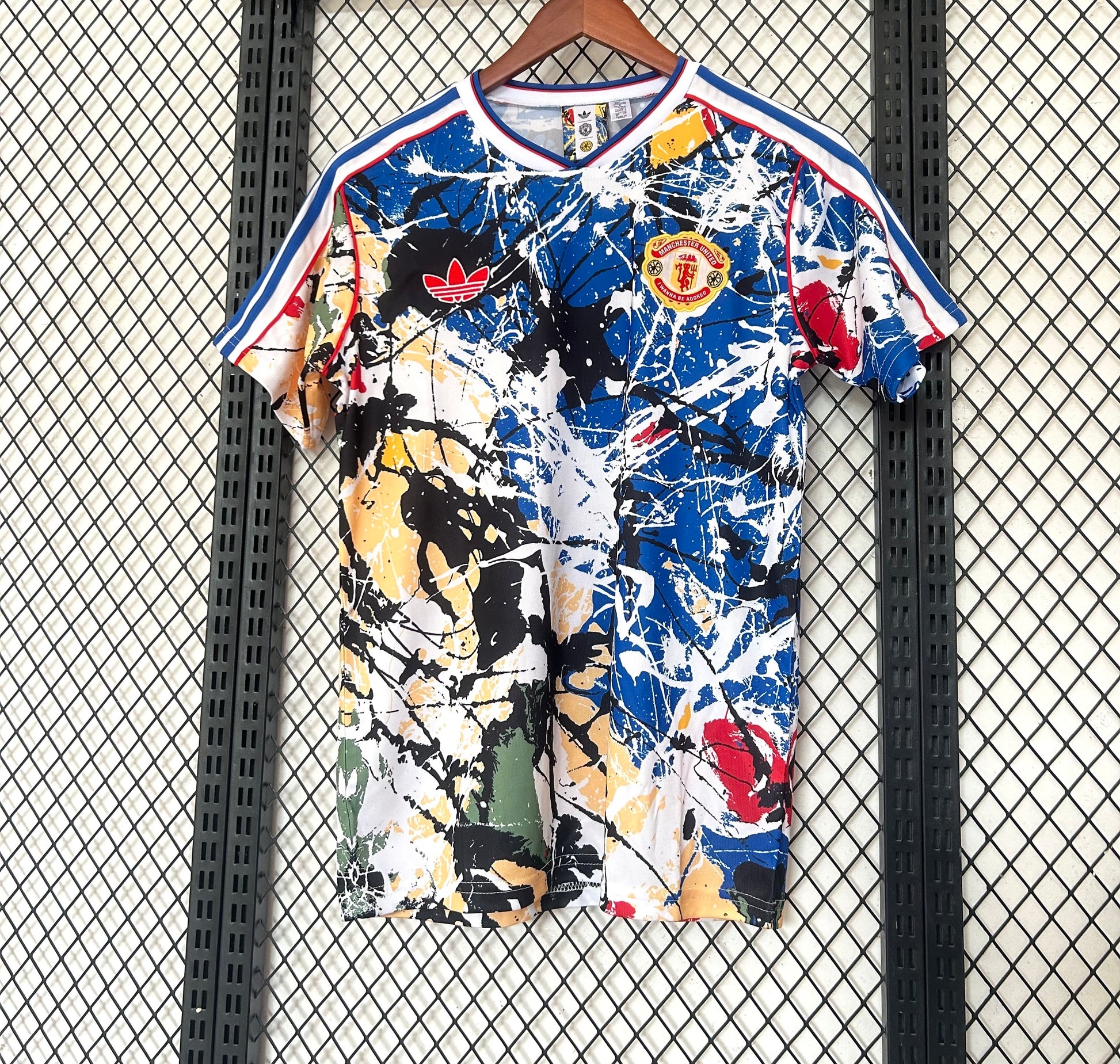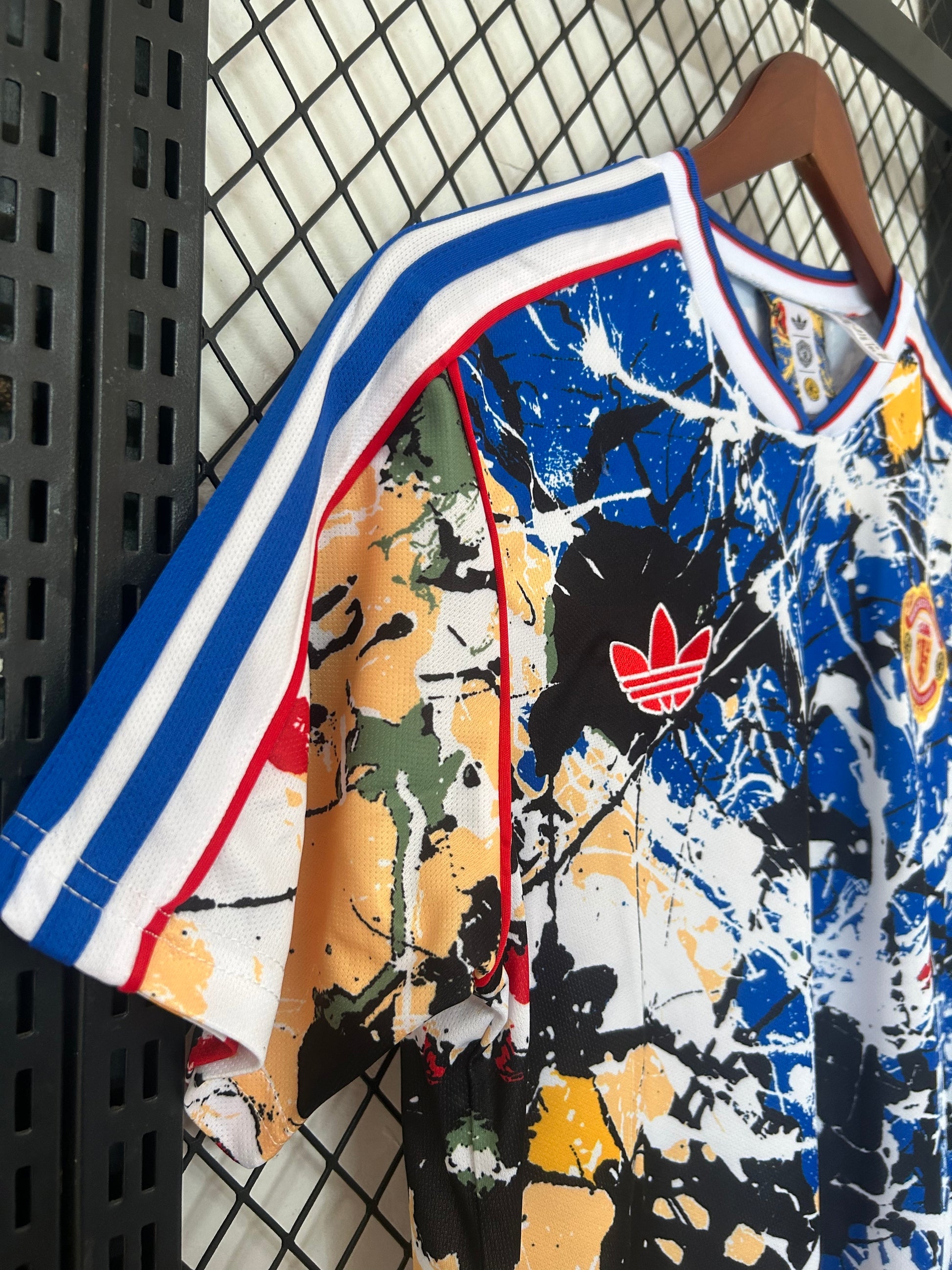 La camiseta del Manchester United 2026/2027 en esta edición especial destaca por su impactante diseño inspirado en el arte abstracto. El estampado multicolor con salpicaduras de pintura crea una estética única que combina el espíritu deportivo con un estilo urbano y artístico.