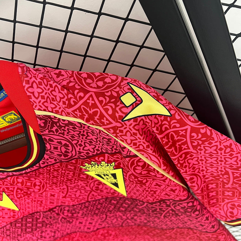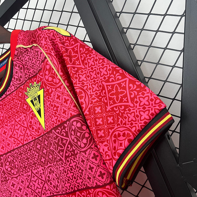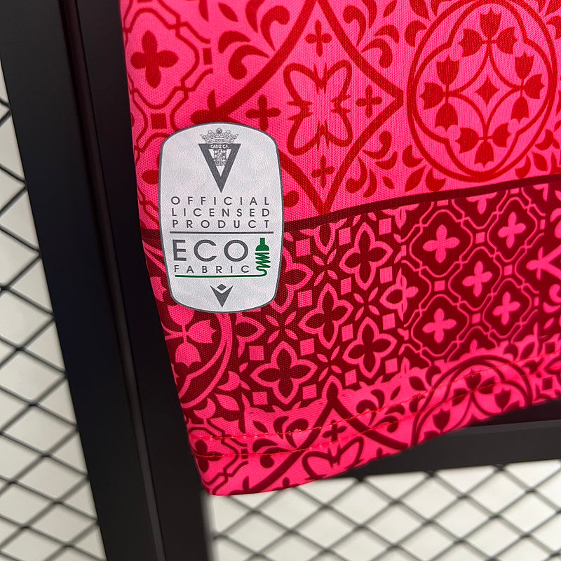 Destaca dentro y fuera del campo con la camiseta oficial del Cádiz CF para la temporada 2025/26 en su segunda equipación. Diseñada por Macron, presenta un llamativo patrón geométrico en tonos rojos y burdeos inspirado en la cerámica andaluza, con detalles en amarillo que resaltan el escudo bordado del club. Confeccionada en tejido técnico transpirable, garantiza comodidad y frescura durante todo el partido. Un diseño moderno y atrevido que combina tradición y estilo para los cadistas más fieles.