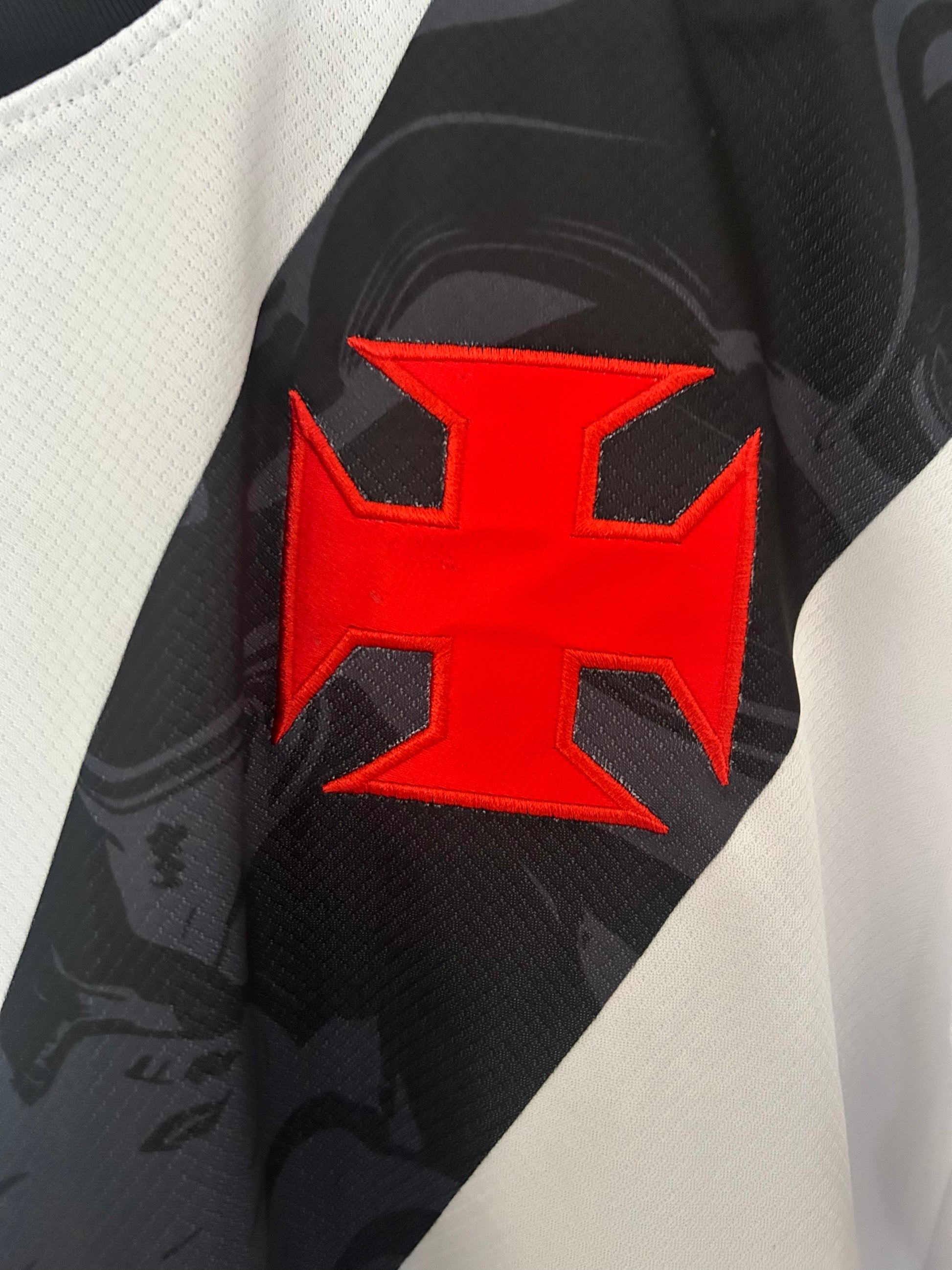 La camiseta visitante del Vasco da Gama para la temporada 2026/2027 presenta un diseño elegante y representativo con fondo blanco y la icónica banda diagonal negra, uno de los símbolos más reconocibles del club brasileño. Sobre la banda destaca la tradicional cruz roja de la Orden de Cristo, emblema histórico del equipo carioca.