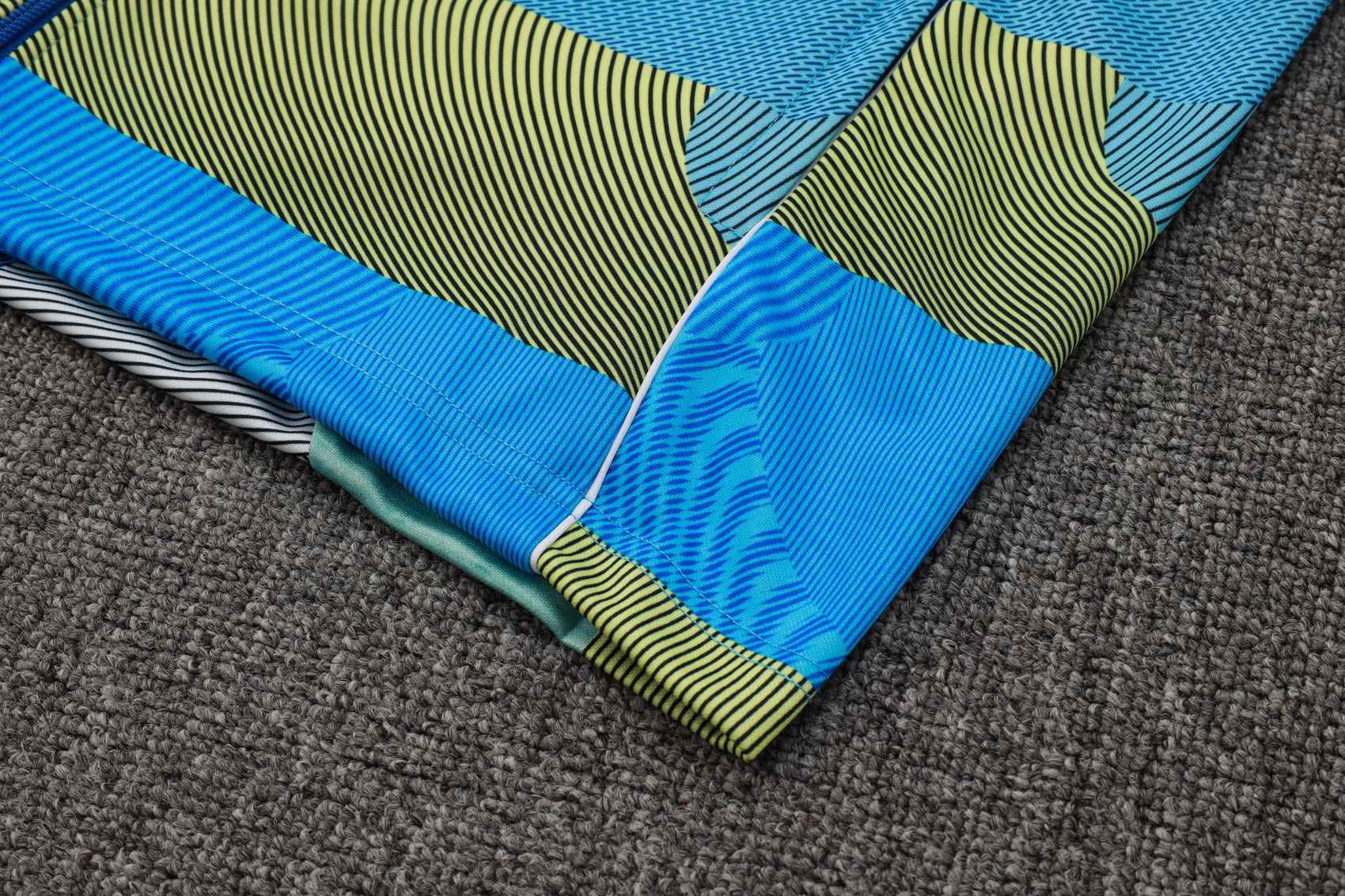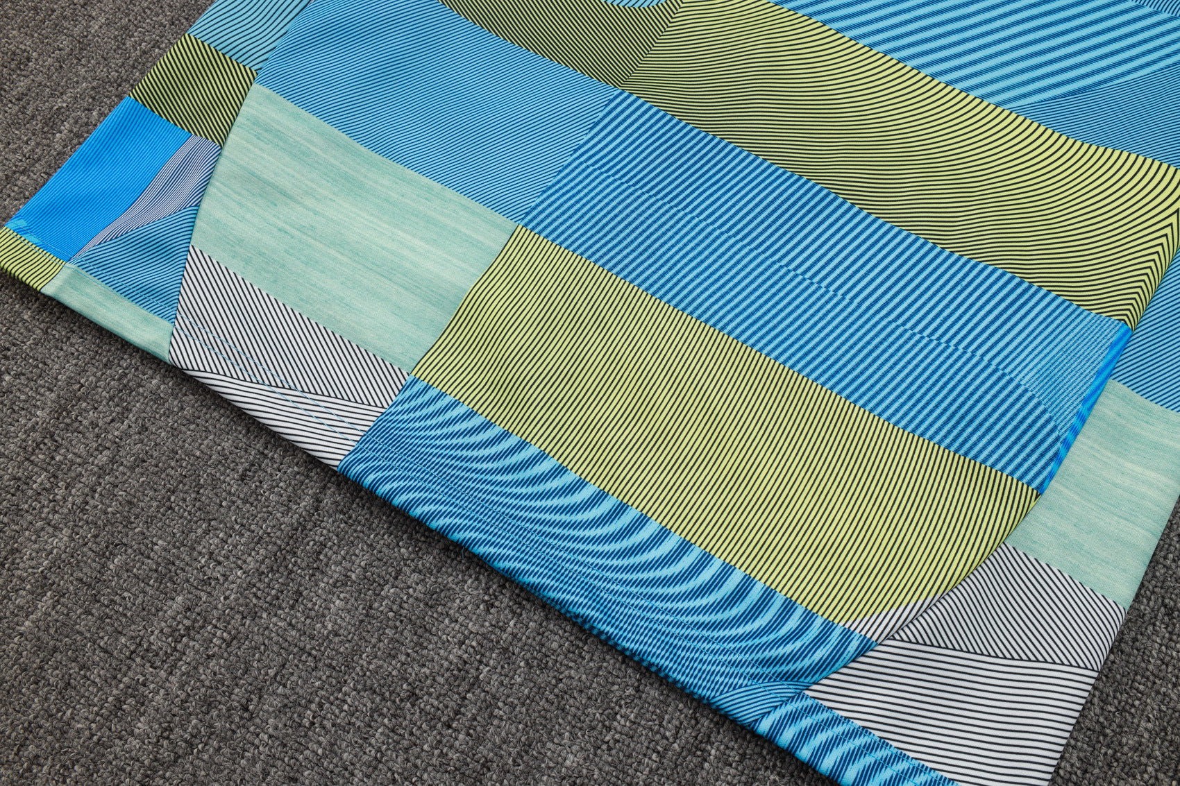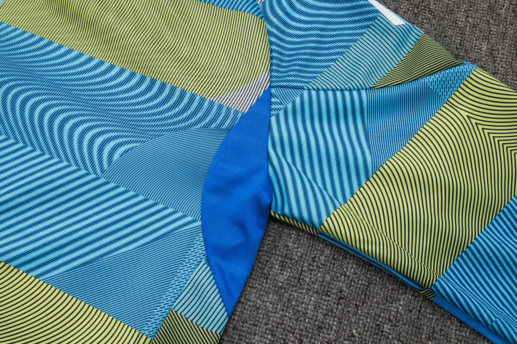 Su diseño geométrico en tonos azul, verde y gris le da un aspecto moderno y atrevido, ideal para los entrenamientos o el día a día.
