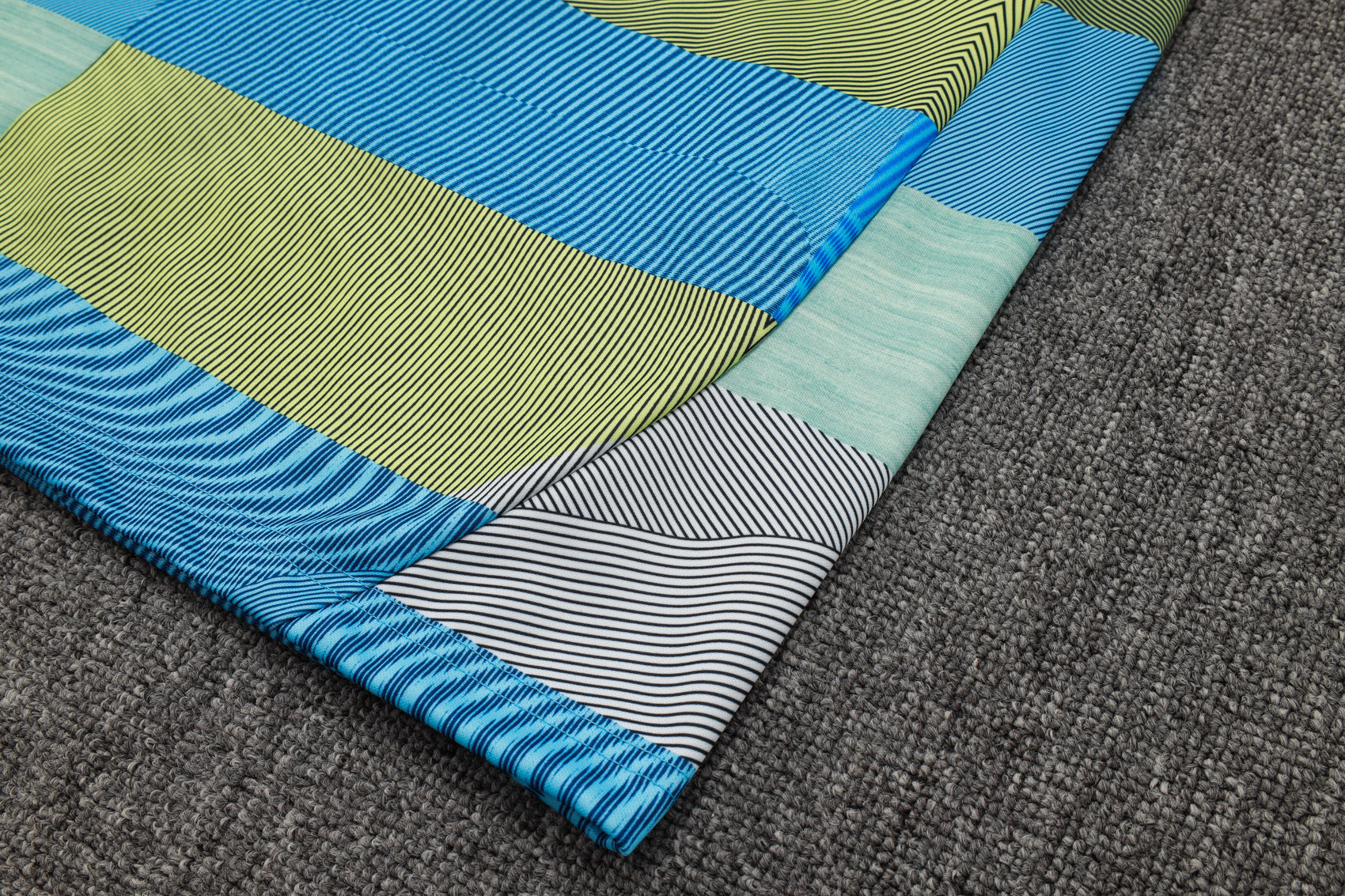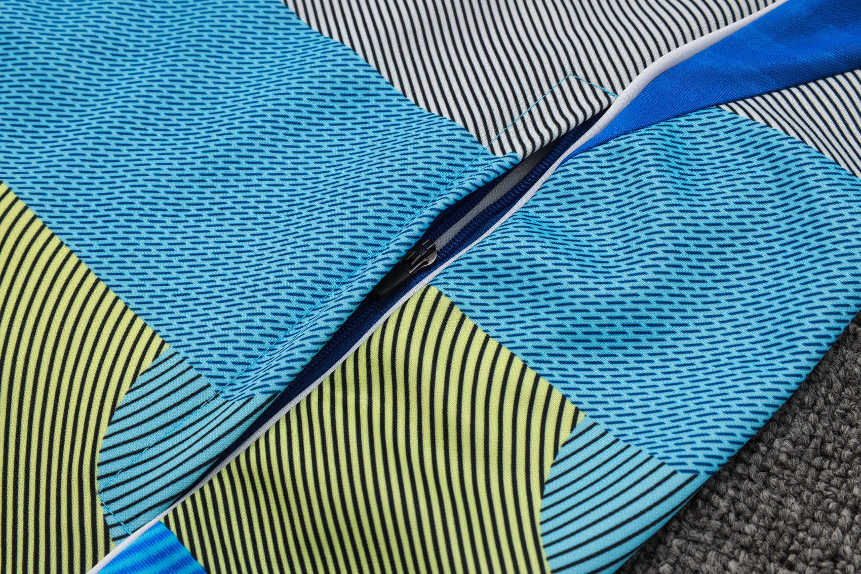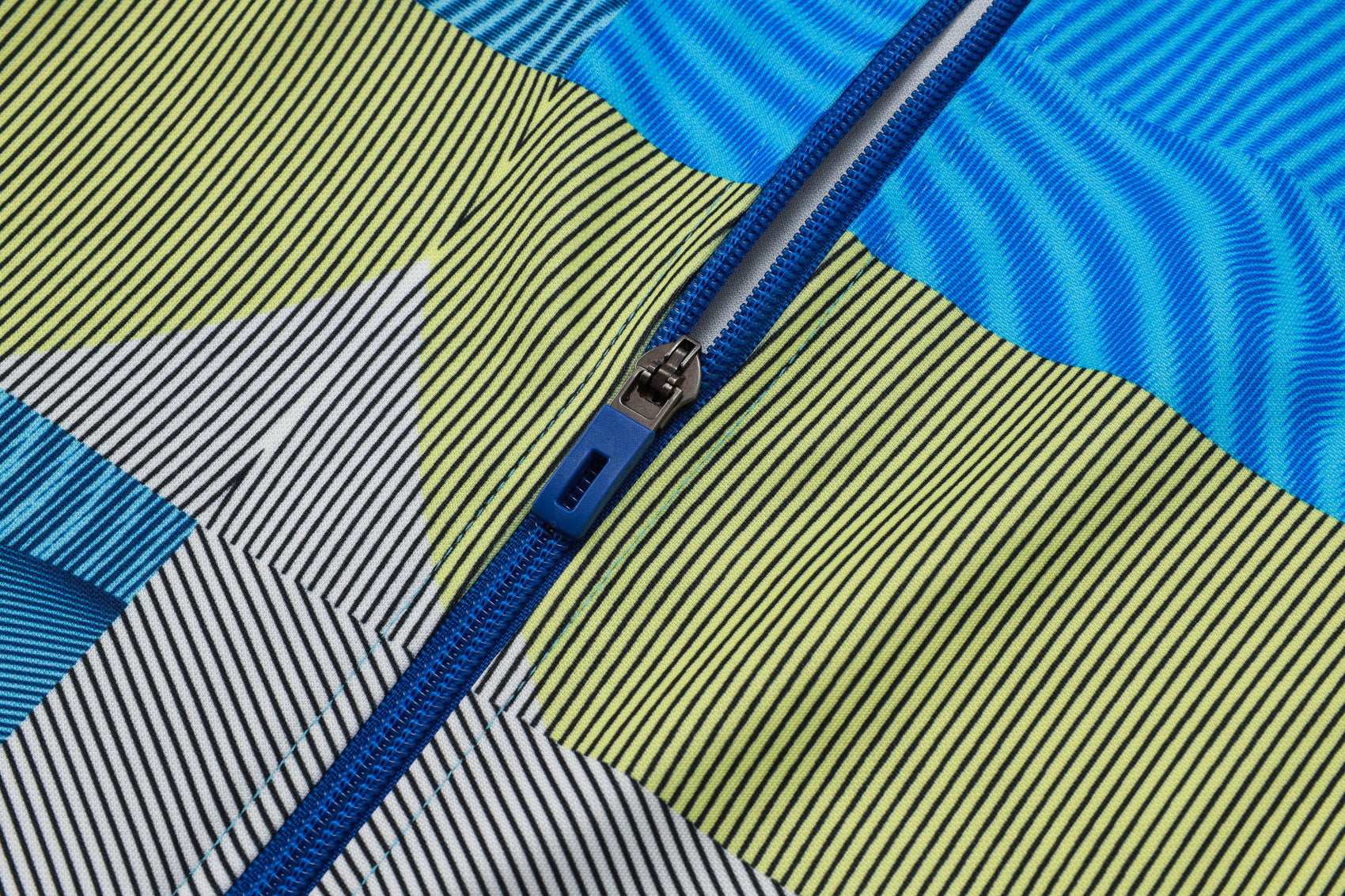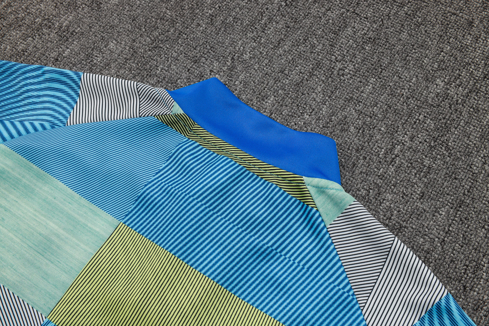Su diseño geométrico en tonos azul, verde y gris le da un aspecto moderno y atrevido, ideal para los entrenamientos o el día a día.