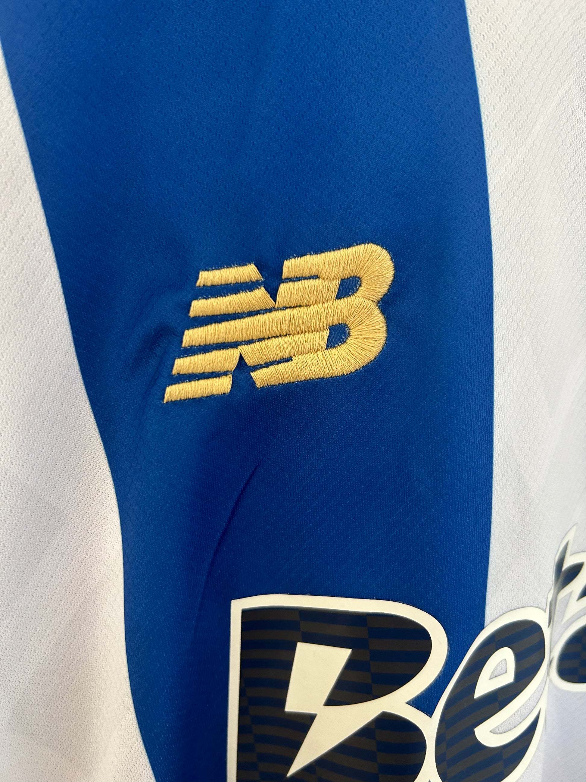 Detalles en dorado metálico: logotipo de New Balance y escudo bordado con acabado premium