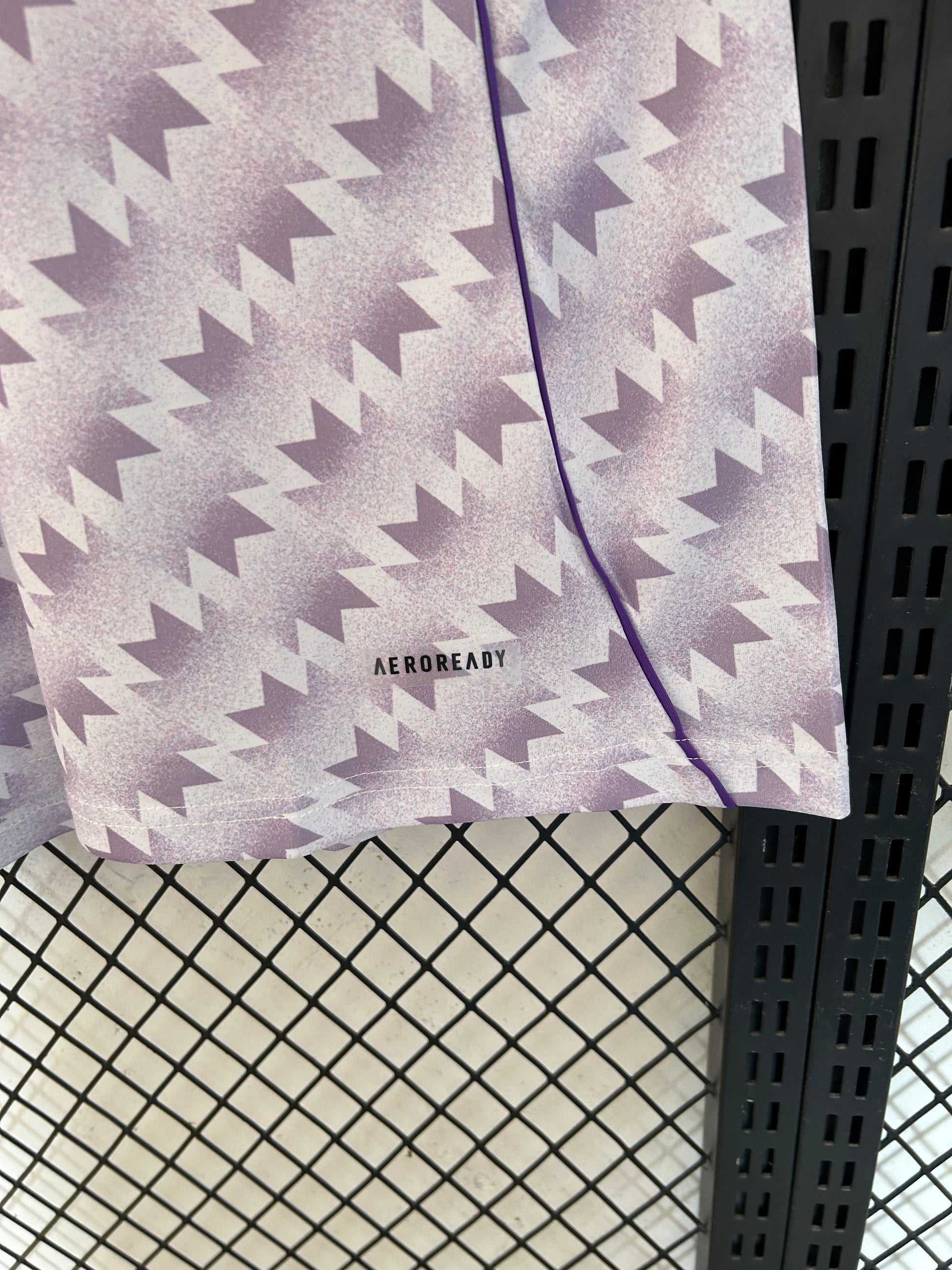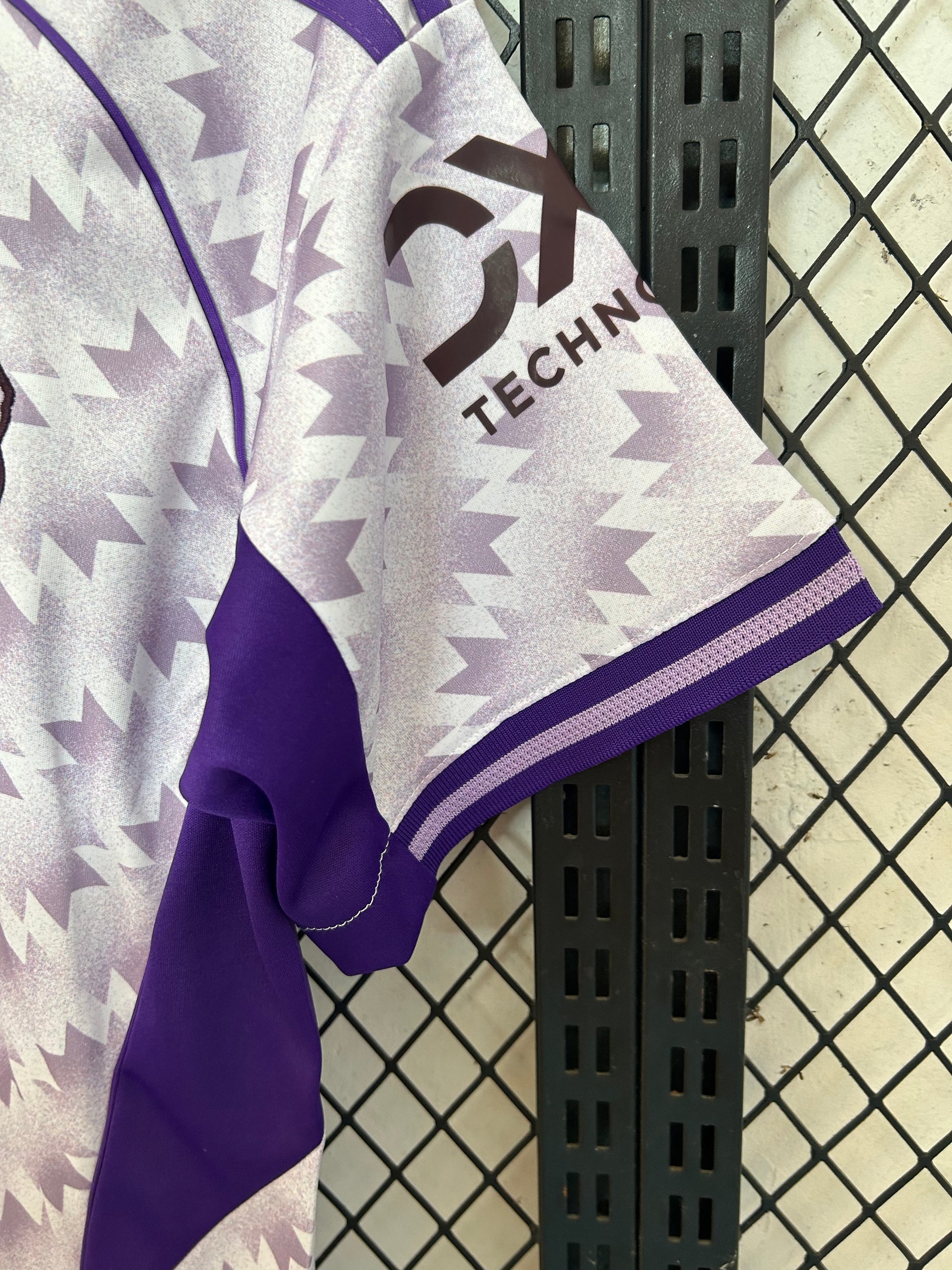 Detalles en pĂşrpura oscuro, incluyendo las franjas laterales, hombros, cuello y logos.