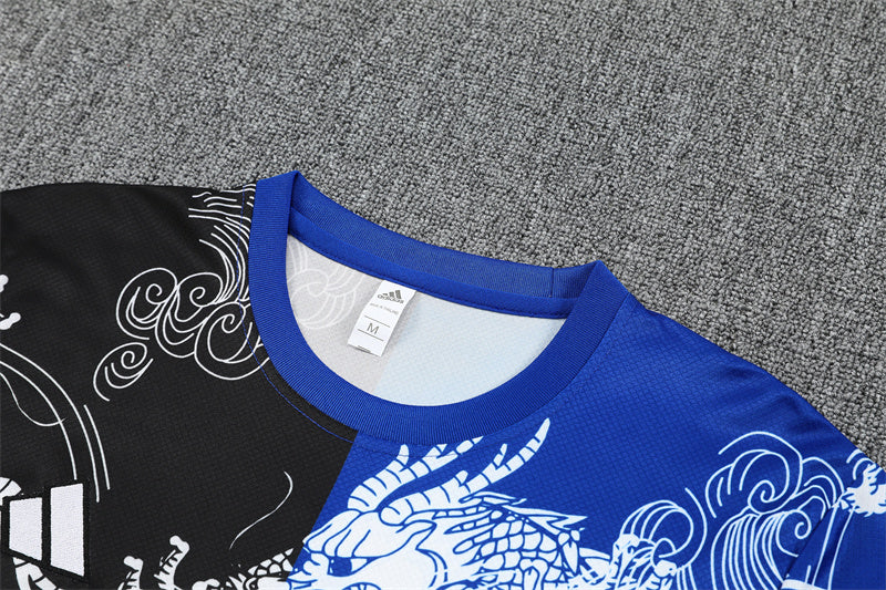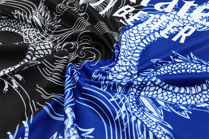 🔵 Mitad azul y mitad negra con un dragón blanco detallado recorriendo el torso, evocando poder, elegancia y mística oriental.