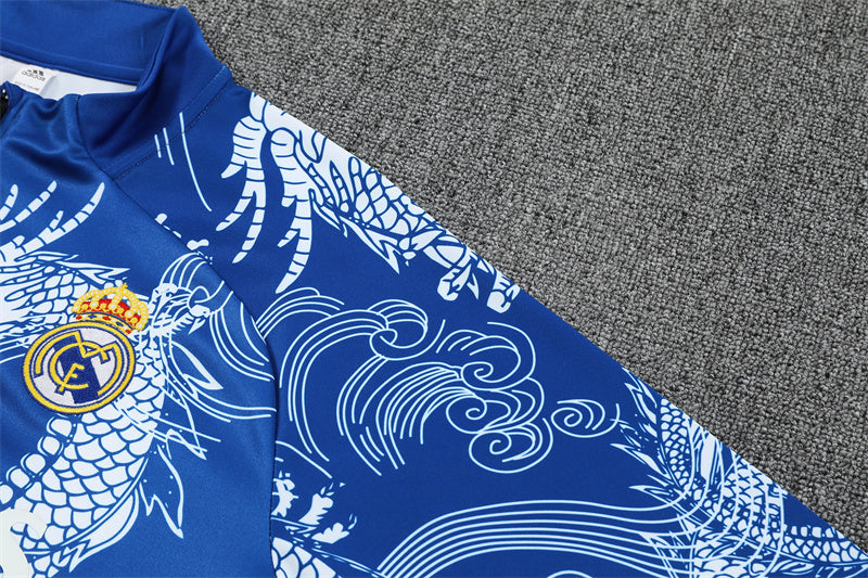Inspirado en el mítico dragón oriental, este conjunto mezcla tradición asiática con la elegancia del Real Madrid. Un diseño imponente para quienes entrenan como campeones.