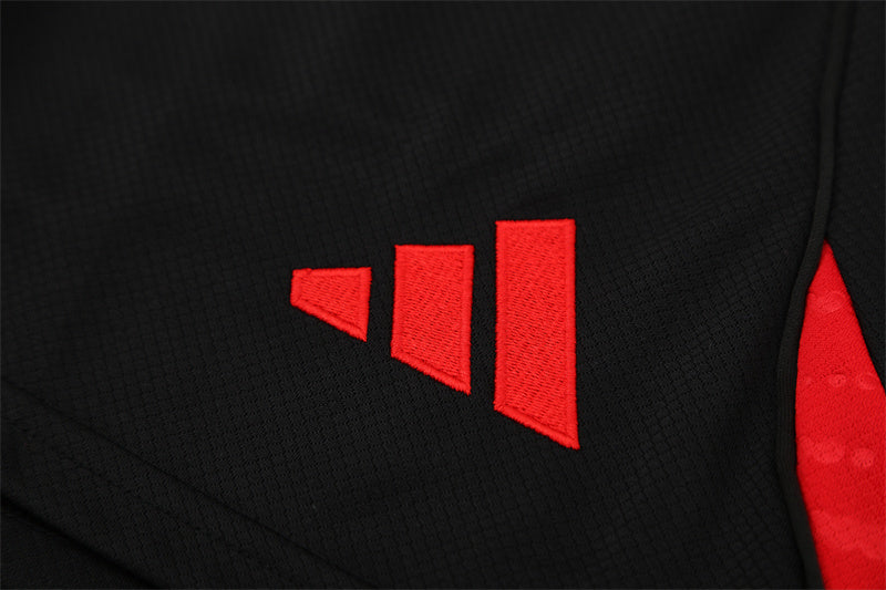 🔹 Escudo y logo adidas en rojo neón, en contraste con la base oscura.